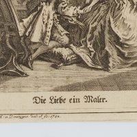 - Inscription: lower left signed in the printing plate: “M. a Drazowa del. et fe.”. Lower middle inscribed in the printing plate: “Die Liebe ein Maler.”. Lower middle dated: “1752”. Upper left further inscription: “3 Th. “.