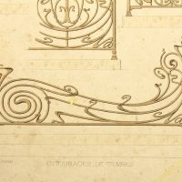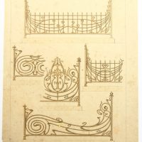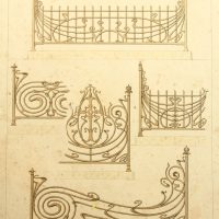- Description: Coloured lithograph on strong paper. The sheet comes from the collective work Ferronnerie Moderne par B.Humbert Dessinateur-spcial de Serrurerie – Librairie Spciale d’architecture Medaille d’Or l’Exposition Universelle de Paris 1900, published by Emile Thzard Fils, Dourdan (Seine-et-oise).Various designs for tasteful, sometimes extravagant artistic ironwork can be seen in full view or in detail, some of which correspond to Art Nouveau design.