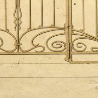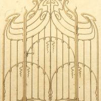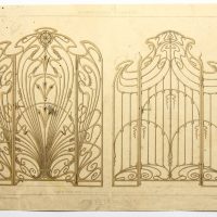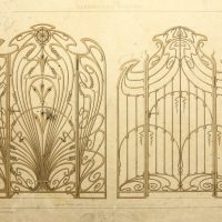 - Description: Coloured lithograph on strong paper. The sheet comes from the collective workFerronnerie Moderne par B.Humbert Dessinateur-spcial de Serrurerie – Librairie Spciale d’architecture Medaille d’Or l’Exposition Universelle de Paris 1900, published by Emile Thzard Fils, Dourdan (Seine-et-oise).View of two elaborate lattice doors with sweeping struts in Art Nouveau design.
