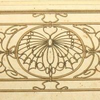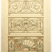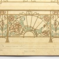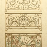 - Description: Coloured lithograph on strong paper. The sheet comes from the collective workFerronnerie Moderne par B.Humbert Dessinateur-spcial de Serrurerie – Librairie Spciale d’architecture Medaille d’Or l’Exposition Universelle de Paris 1900, published by Emile Thzard Fils, Dourdan (Seine-et-oise).View of three elaborately decorated stair railings with curved forms with floral motifs and depiction of butterflies in the design of Art Nouveau.