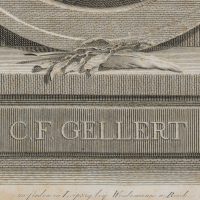 Chest portrait to the right in an oval frame decorated with garland at the top on a plinth with inscription plate; on the plinth quill and laurel. Inscribed: C. F. Gellert. Inscribed below the depiction: “A. F. Oeser pinx. // I. F. Bause sculps. Lips. 1767 // to be found in Leipzig, bey Weidemann u. Reich.”