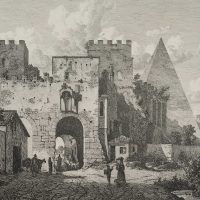- Beschreibung: Altes Gebäude in der Stadtmauer mit zwei viereckigen, zinngekrönten Thürmen. Rechts ist die bekannte Pyramide des Cestius zu sehen. Ein beladener Karren von einem Maultier gezogen bewegt sich zum Tor hin, Maultiertreiber steht links am Tor.