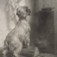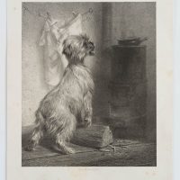 - Description: Bright little dog in the interior with a split piece of firewood in front of a stove. Next to it a pair of trousers hanging on a line to dry. Signed in the centre above the print, inscribed „Tantalus“ in the centre below. Below the name of the printer: „Druck v. W. Horn in Berlin“.