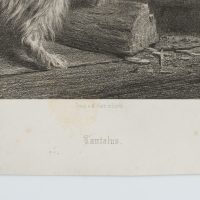 - Beschreibung: Aufgeweckter kleiner Hund im Interieur mit einem gespaltenen Stück Brennholz vor einem Ofen. Daneben eine Hose zum Trocknen an einer Leine hängend. Mittig oberhalb der Graphik signiert, mittig unterhalb beschriftet mit „Tantalus“. Darunter der Name des Druckers: „Druck v. W. Horn in Berlin“.