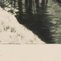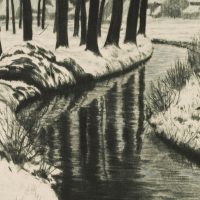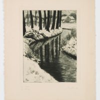 Franz Bender (1873 Germersheim – 1905 Leipzig), ‚Am Bach‘. Schneebedeckte Winterlandschaft mit Bachlauf und Bäumen, , Radierung