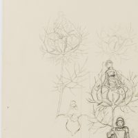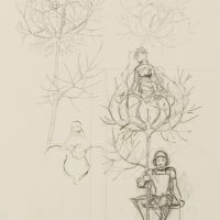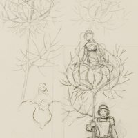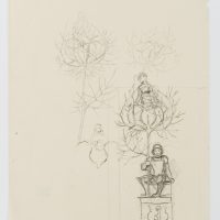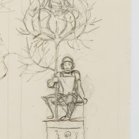 - Description: The drawing served as a sketch for the etching “Gretel im Grünen” from 1915 (cf. Verz. d. Radierungen No. 165). A knight in his armour with helmet and lance is sitting on a pedestal. From the tip of the lance emerges a flower surrounded by thorny, sheetless branches, in which again a female figure is enthroned. To the left and above are two further sketches of the female figure and the blossom in the thorny cage. This and other works in the exhibition come from a portfolio of sketches from the personal estate of Hans Thoma.