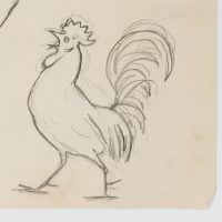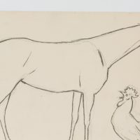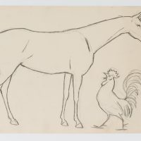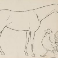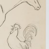 - Description: The largest space is taken up by the figure of the horse in profile to the right, next to it a crowing cock struts to the left. The strongly traced contour lines were probably used for later translation into printing techniques or transfer into a (wall) painting (friction marks on the reverse indicate this). This and other works in the exhibition come from a portfolio of sketches from the personal estate of Hans Thoma.