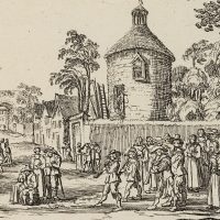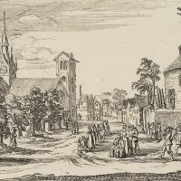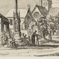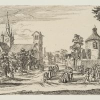 - Description: In the style of Callot, engraved, multi-figured scene in a village. A bridal couple, accompanied by musicians, enters the scene from the right and marches towards a free-standing cross. They are accompanied by a trellis of villagers towards the church in the centre of the page.