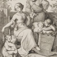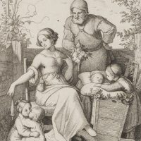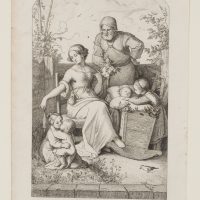 Ludwig Richter (1803 Dresden – 1884 ebd.), Idyllische Szene einer kinderreichen Familie, um 1850, Stahlstich