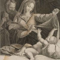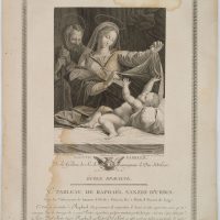 - Description: Signed below: ‚Peint par Raphael Sanzio d’Urbin‘, ‚Dessiné par Jourdain‘ and ‚Gravé par A. Romanet.‘; titled and inscribed at lower centre: ‚SAINT FAMILLE‘, further: ‚De la Galerie de S.A.S. Monseigneur le Duc d’Orleans. / A.P.D.R. / ÉCOLE ROMANE. / VE. TABLEAU DE RAPHAËL SANZIO D’URBIN. / Peint sur Toile, ayant de hauteur 3 Pieds 7 Pouces, sur 2 Pied 8 Pouces de large‘, and six lines of French inscription: ‚Ce Tableau..méprendre.‘.