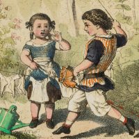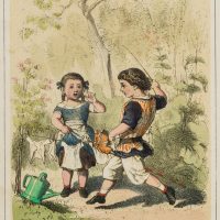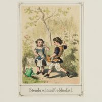 - Beschreibung: Aus der Hand Theodor Hosemanns, deutscher Graphiker, Kunstmaler, Zeichner, Illustrator und Karikaturist. Er gilt neben Adolf Menzel als wichtigster Lithograph in der Frühzeit dieser Technik in Berlin. Zur Darstellung: Vermutlich eine Kinderbuchillustration, die ein kleines Mädchen und ihren Spielkameraden zeigt, der auf einem Steckenpferd durch den Garten galoppiert. In der linken unteren Ecke der Darstellung monogrammiert und datiert: “TH 1852”.