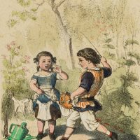 - Description: From the hand of Theodor Hosemann, German graphic artist, painter, draughtsman, illustrator and caricaturist. Along with Adolf Menzel, he is considered the most important lithographer in the early days of this technique in Berlin. About the image: Probably a children’s book illustration showing a little girl and her playmate galloping through the garden on a hobby horse. Monogrammed and dated in the lower left corner of the illustration: “TH 1852”.