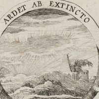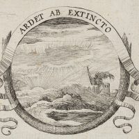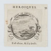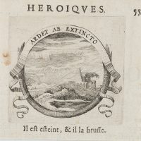 - Inscription: Upper middle inscribed in the printing plate: “ARDET AB EXTINCTO”. Lower middle further inscription: “Il est esteint, & il la brufle.”.