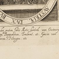 - Inscription: At the center inscribed in the printing plate: „ALBERTUS D.G. ARCHIDUX AUSTRIAE DUX BURGUND BRAB COM FLANDRIAE“. Lower middle further inscription: „Albertus by der gratsien Gods Aerts-hertoch […]“.
