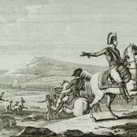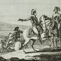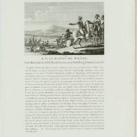 - Beschreibung: bezeichnet „Lecor[…] aquaforti“ Zu sehen ist eine Szene aus den Napoleonischen Kriegen. ImVordergrund eine Grupper von Reitern, welche auf eine Szene im Mittelgrund verweisen. Ein Pferd und mehrere Männer liegen dort am Boden. Begleitet wird die Darstellung von einem Text, welcher die militärische Karriere des Dargestellten beschreibt.