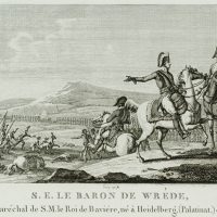 - Description: inscribed „Lecor[…] aquaforti“ A scene from the Napoleonic Wars is depicted. In the foreground a group of horsemen pointing to a scene in the middle ground. A horse and several men are lying on the ground. The depiction is accompanied by a text describing the military career of the sitter.