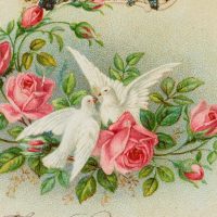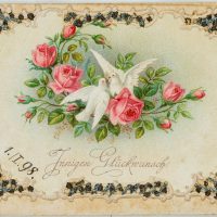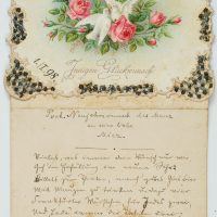 - Description: Chromolithography on embossed cardboard with glitterWonderful coloured embossed card. Two doves sitting on a rose branch; ornaments designed with glitter and perforations. Underneath: “Innigen Glückwunsch” and handwritten in ink dated “1.I.98”. Fold-out a beautiful handwritten letter.