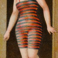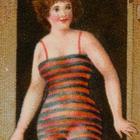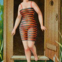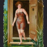 Unbekannt (19. Jahrhundert), Karte mit Dame in moderner Bademode vor Badekarren, um 1900, um 1900, Chromolithographie