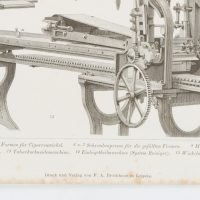 - Bezeichnung: Unten mittig im Druck bezeichnet: “MECHANISCHE TECHNIK. | 1 Zuschneiden der Deckblätter für Cigarren. 2 Wickeln der Cigarren. 3-5 Formen für Cigarrenwickel [..]”. Oben rechts im Druck nummeriert: “Taf. 16.”.