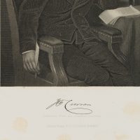 • Description: Half-length portrait, sitting in an armchair at a table and writing a letter with a pen. He has his left arm resting on the table and is thinking. Below the print with facsimile signature of the sitter.