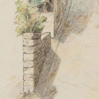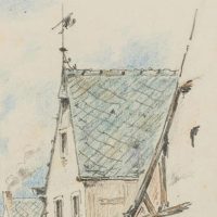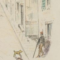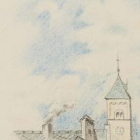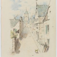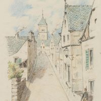 - Description: View through a street alignment towards a Romanesque church tower. In the foreground a man walks with his small dog. The drawing comes from the sketchbook of an anonymous German artist at the turn of the 20th century.
