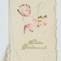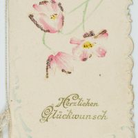 • Beschreibung: Farbdruck. Feine Glückwunschkarte mit zarten Blüten und kolorierter Prägung; Verzierungen mit Glitter. Innen handschriftlich mit Tinte datiert auf den 18.10.1906