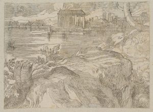Unbekannt (18.Jhd), Stadtlandschaft am Fluss, um 1700, Radierung Barock