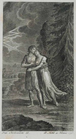 KOHL (18.Jhd, 19.Jhd) nach CHODOWIECKI (*1726), Liebespaar bei Gewitter am Waldr