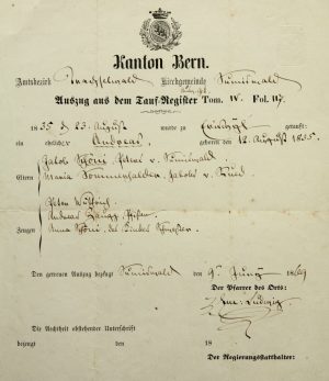 Unbekannt (19.Jhd), TAUFBRIEF, Kanton Bern, Amtl. Urkunde, Tusche, 1835,