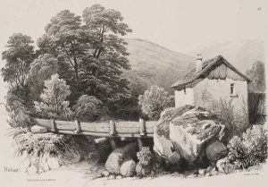 J. HUBERT (1801-1865), Steinhaus mit rustikaler Brücke, 1850, Romantik