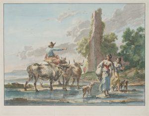 Unbekannt (19.Jhd), In der Furt, Kühe und Bäuerinnen, 1860, Radierung Figürlich