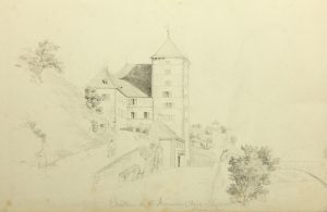 O. HUGUENIN (1842-1903), Ansicht des Château de Saint-Maurice, 1868, Bleistift