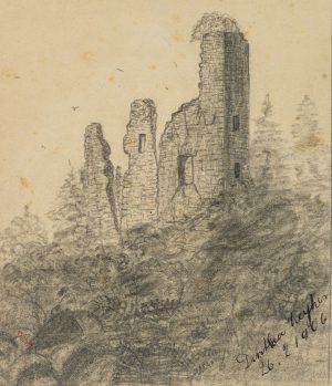 D. ZEYHER (19.Jhd), Ansicht einer Burgruine, 1906, Bleistift Romantik