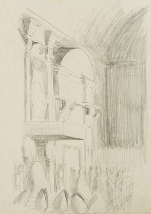 Monogramm CS (20.Jhd), Bischöfe mit Mitra in einer Kirche, 1924, Bleistift