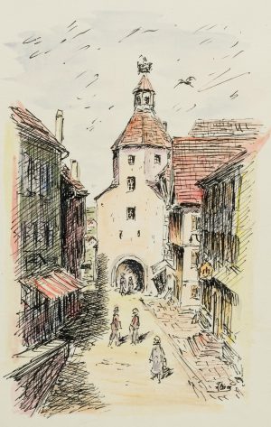Unbekannt (20.Jhd), Blick in eine Straße mit Stadttor, 1946, 1946, Realismus