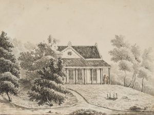 Unbekannt (19.Jhd), Winterliches Gehöft am Wasser, um 1860, Bleistift Romantik