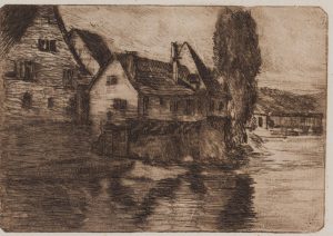 Unbekannt (20.Jhd), Häuserfassaden mit Kirchturm, Badischer Odenwald, um 1900,