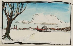 B. BURGER (1892-1968), Flache Schneelandschaft mit Siedlung in der Ferne, Feder