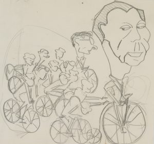B. BURGER (1892-1968), Fahrradrennen mit Anzugträger auf Hochrad, Bleistift