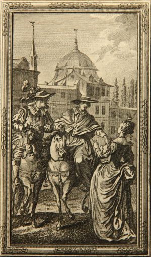 F. VIDAL (*1698), Zwei Kavaliere zu Pferd treffen eine Dame, Klassizismus Mode