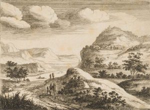 J. ALMELOVEEN (*1652), Flusslandschaft mit Dorf am Hang, Radierung Romantik