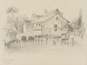 O. KIRCHEIS (*1862), Gehöft am Fluss, Deutsche Akademieschülerin, um 1900, Bleis