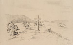 R. SCHMIA (20.Jhd), Denkmal mit Kreuz auf einem Plateau, Bleistift Realismus