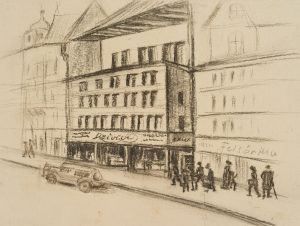 R. SCHMID (1896-1971), Stadtszenerie mit Spaziergängern, um 1950, Figürlich
