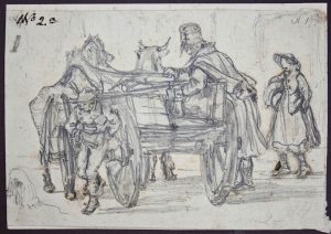 T. HORSCHELT (*1829), Marktwagen mit Soldat, Bleistift Romantik Berufsleben
