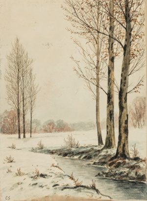 Unbekannt (19.Jhd), “CS”, Bachlauf in verschneiter Landschaft, Romantik