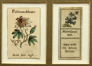 Unbekannt (19.Jhd), 2 Grußkärtchen mit Sinnspruch und Blumen, Rad. Romantik