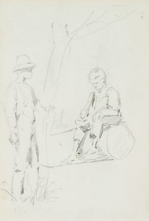 Unbekannt (19.Jhd), Waldszene mit zwei jungen Männern, Bleistift Romantik