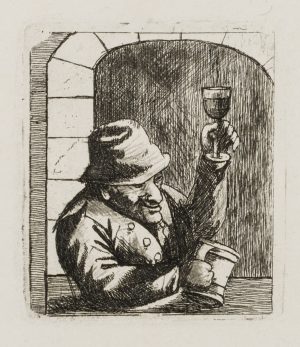 Unbekannt (19.Jhd), Zechender Bauer im Wirtshaus, Radierung Romantik Landschaft
