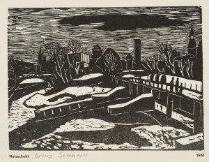 D. SCHULMANN (*1881) zug., Flusslandschaft mit Wald u. Brücke, 1946, Impressio